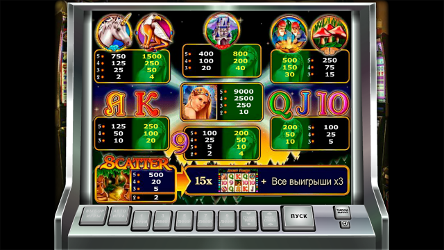 • Номиналы игральных карт, фантастические существа, замок. Цепочки, формируемые ими, оплачиваются по коэффициентам х4-х1500.